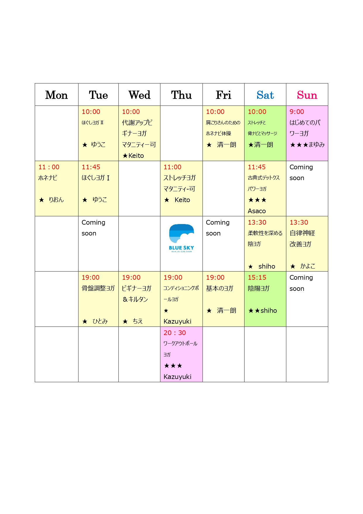 横浜市中区(関内)にあるブルースカイヨガスタジオでは、早朝7時から夜22時までレッスンをご用意しております。目的やインストラクターが異なりますので、ご希望に合わせたレッスンへお気軽にご予約ください。ブルースカイヨガスタジオではどなた様も安心してヨガを楽しんでいただけるよう、最大10名までの少人数レッスンで、お一人お一人に行き届いたきめ細やかなサポートをしております。そのため、基本的にご予約制となっておりますが、ネットからもお気軽にお申し込みいただけます。